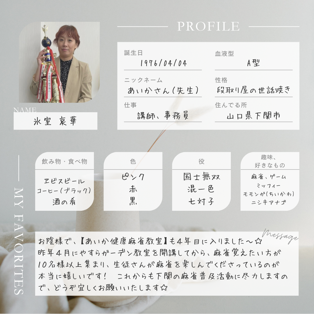 2023年の活動は、自宅でのレディース麻雀個人レッスン及び、下関彦島公民館での健康麻雀教室、下関市田倉の青山自治会館での健康麻雀教室のお手伝い、初心者・レディース・子ども向けの麻雀体験会を行いました。